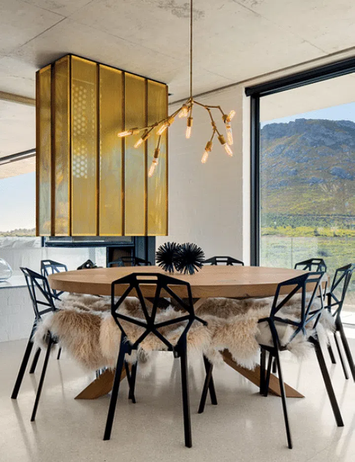 The dining room features a custom-made table by James Mudge that is accentuated by a Lindsey Adelman pendant light. The black Magis chairs are softened with sheepskin throws.