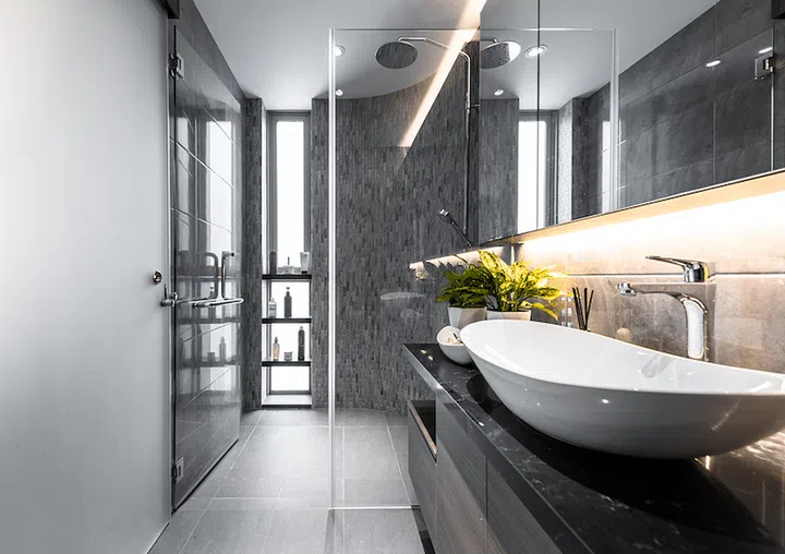 In contrast to the master bedroom, dark grey tiles were used throughout the bathroom. Potted plants were added to the bathroom for a touch of nature, to lend a resort-like ambience.