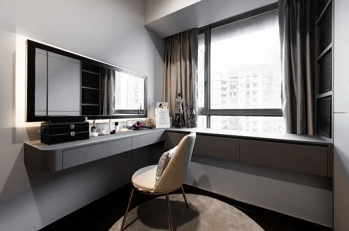 Throughout the apartment, the designers made use of a neutral colour palette comprising beige, grey and black, in line with their clients’ desired modern theme. Rose gold accents help to imbue an understated luxe look.