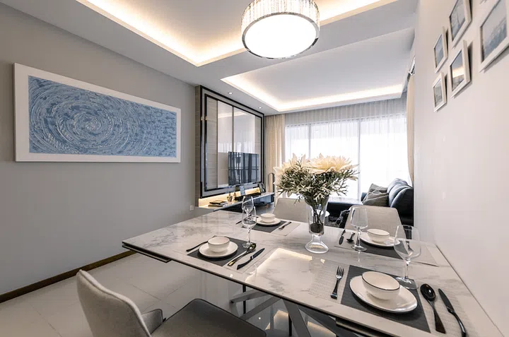 As a newly-wed couple, the homeowners of this three-bedroom condominium apartment longed for a cosy home with a touch of hotel luxury, where they could settle down and start a family. They requested design firm The Orange Cube to create an inviting home with plenty of storage space, and to adhere to fengshui requirements provided by a fengshui master.