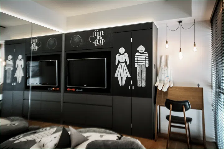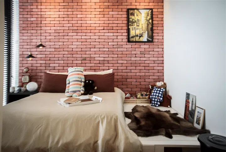 The daughter’s room on the third floor has a different style from the rest of the house. Derrick installed Craftstone’s Craftbrick faux bricks on the wall behind the bed, and paired them with a platform made out of wood pallets.