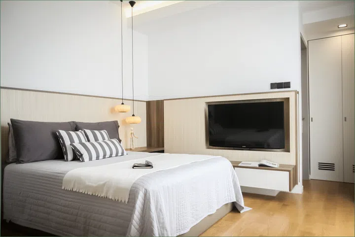 In the sunny master bedroom on the second storey, Derrick built a headboard for the bed with wood-lookalike laminates. Berry pendant lamps from Verde Light are decorative accents in the cosy room.