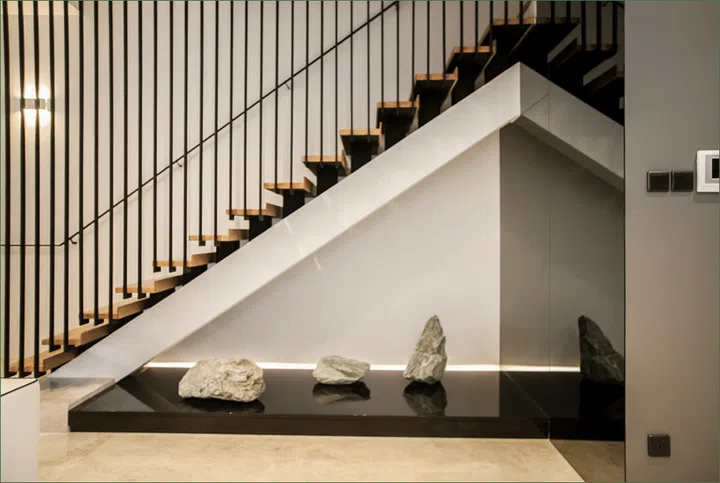 The “caged” staircase and the “reflective pond”, made of granite in a glossy finish, are standout visual features in the home’s interiors.