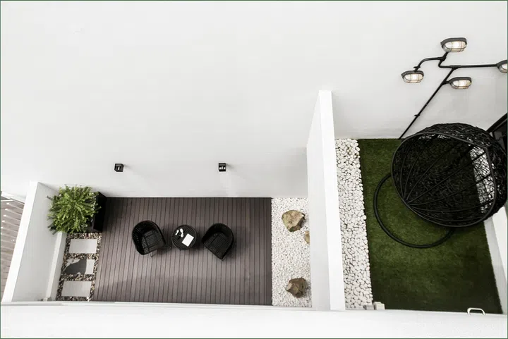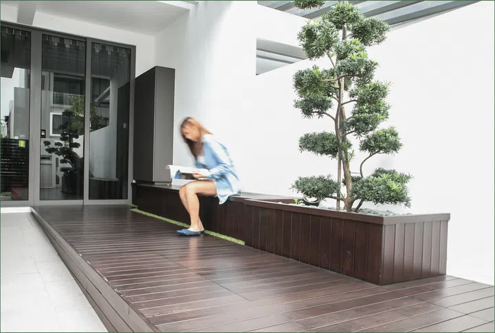 The brief given to Derrick Lim from D’Marvel Scale for this three-storey terrace was to create clean and uncluttered spaces. A raised platform decked in chengal wood leads the way in from the main gate of the home. This neutral colour palette corresponds to that of the indoor spaces.