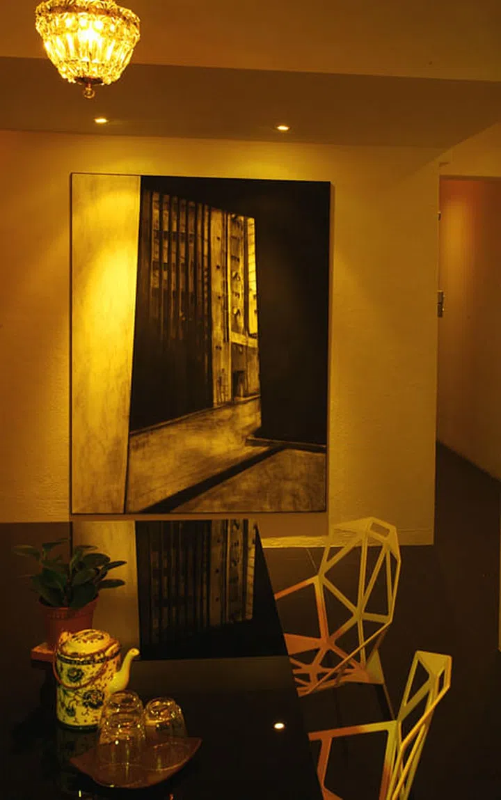 “As idiosyncratic as they are eclectic, the collected furniture ranges from Konstantin Grcic’s Chair One to Eero Saarinen’s Tulip Chair. Justin Lee’s Pop art inspired fiery-red Chinese motifs adorns a sliding partition in the living space that hides a study. Fellow local artist Tang Ling Nah’s haunting black and white charcoal drawing of the Singapore cityscape acts a balanced counterpoint in the dining room.”