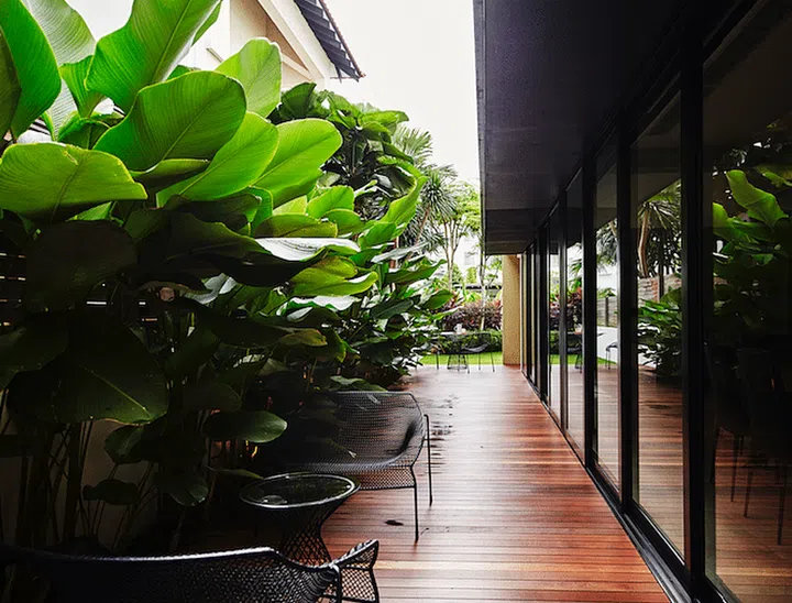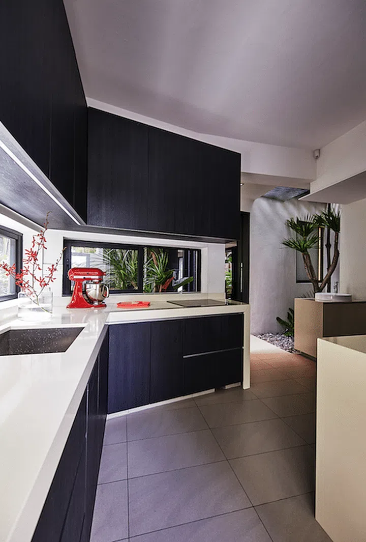 Contrast is brought into the interiors to accentuate specific areas in the home: For example, columns are deliberately highlighted with a coat of black paint to match the aluminium doors on the first floor. With one of the extensions added at the back of the house to accommodate the kitchen and laundry area, such utilitarian spaces are kept out of sight. This strategy also allows a larger dining area for the family to host family and friends. Despite being inside the house, the homeowners are still in close proximity to the surrounding environment as large sliding doors remove the boundaries between the indoors and outdoors.
