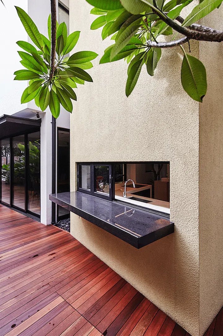 A cutout on the facade wall keeps the kitchen naturally ventilated, while off ering additional counter space along the exterior of the house.