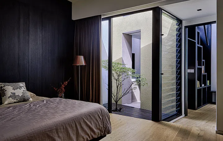 The placement of the airwell is part of a strategy to allow more light into the interior spaces, and areas such as the master bedroom and the back of the house now enjoy lots of natural light. Louvre windows are used in most of the spaces as a way to allow cross ventilation. This way, the home is always kept naturally cool, with less reliance on air-conditioning.