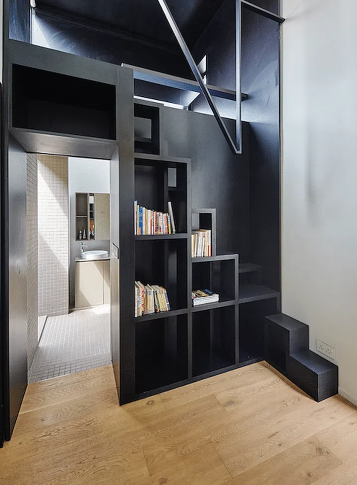 Instead of regular staircases that may look bulky within this small space, the book shelves double as stairs to the upper level, with handrails above the bookcases to frame the area.