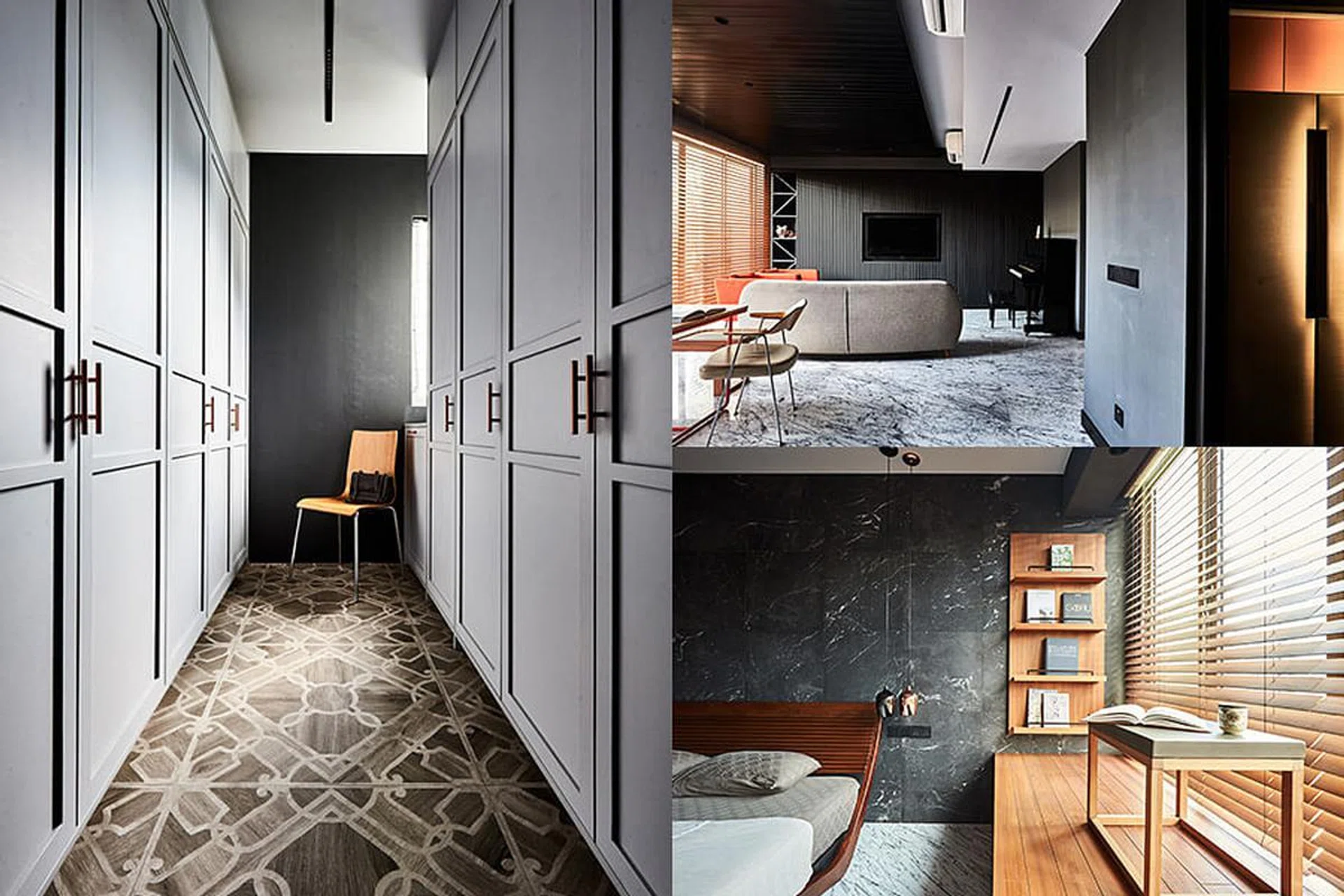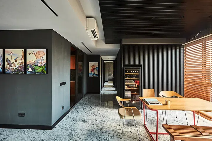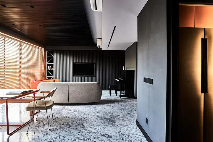 Addressing the clients’ preference for monochromatic colours, the interior designers made a bold move and proposed a dark colour palette.