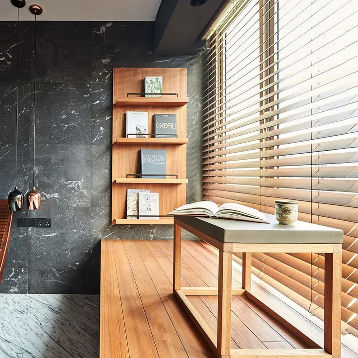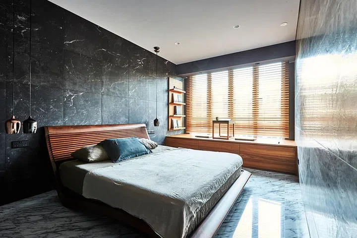 The couple wanted a cosy corner within their master bedroom where they can relax and read, and the bay window provided the perfect spot. The interior design team extended the bay window such that it forms a raised platform beside the window.