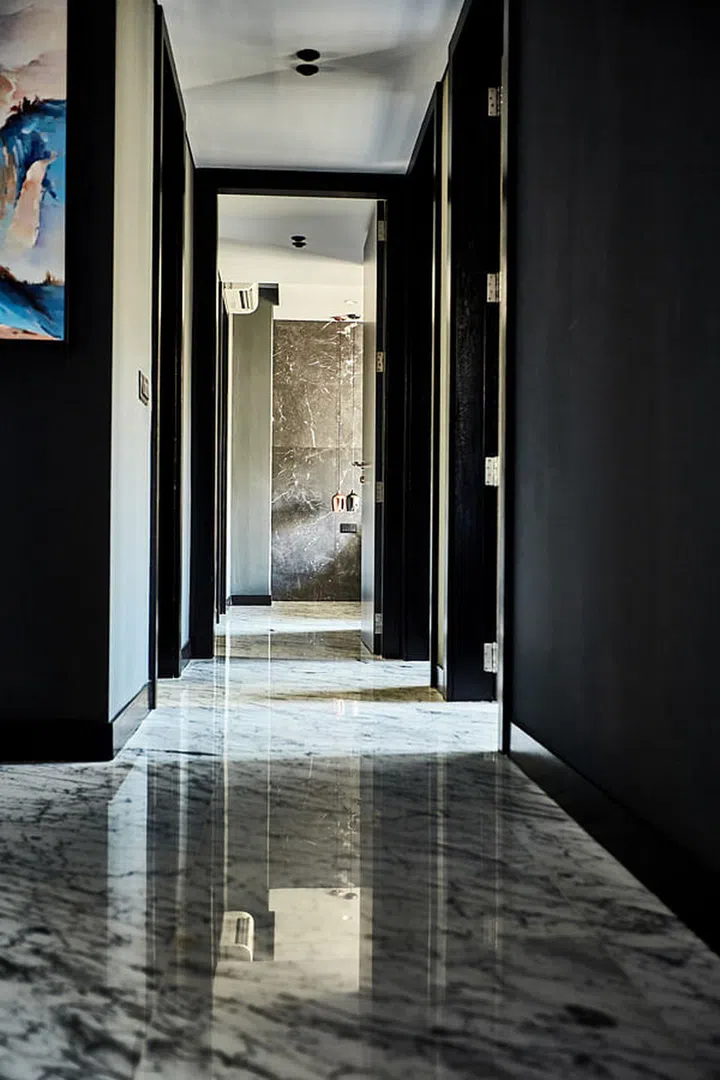 The natural Carrara marble flows across almost the entire apartment floor, including the master bedroom and the 13-year-old daughter’s bedroom.