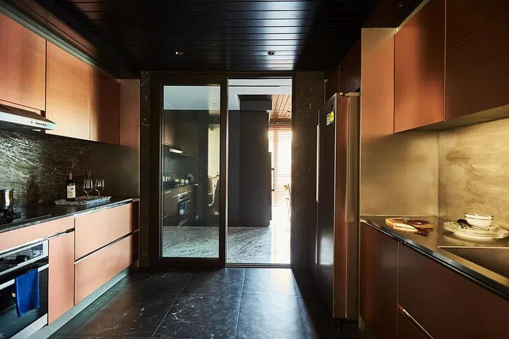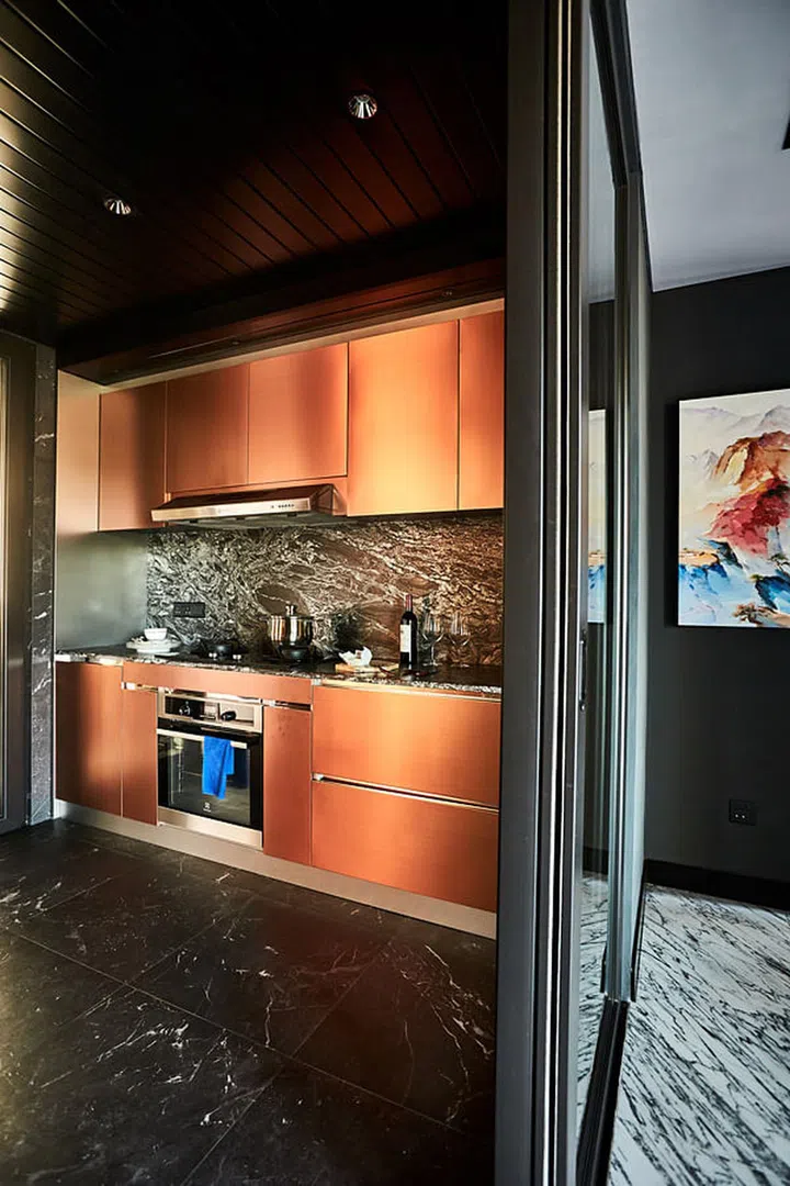 The rose gold stainless steel cabinets in the kitchen not only make a visual statement, but are also durable and low-maintenance.