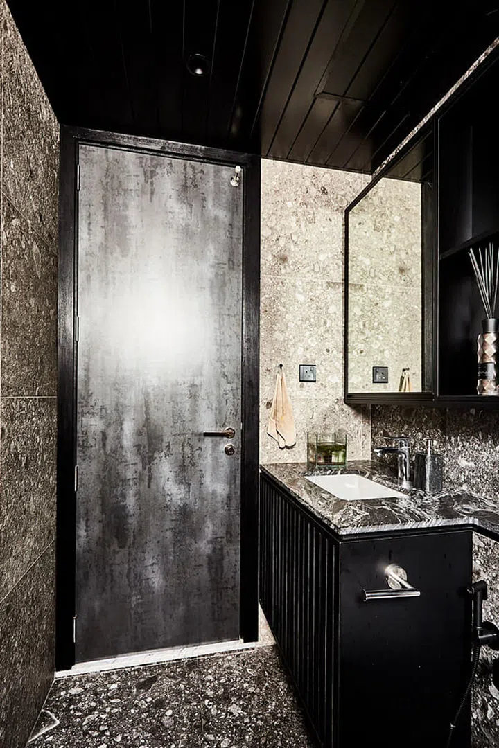 The walls are either painted a monotone grey or clad with grey marble or tiles, while the darkest, almost black colours are taken on by the built-in cabinet doors, bedroom doors, door frames and skirting.