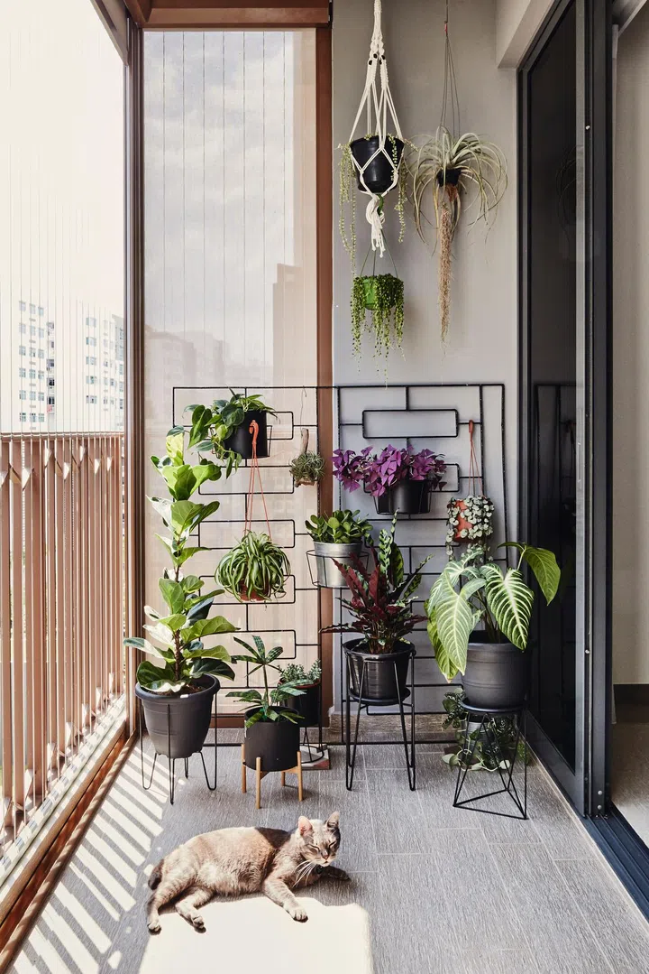 Domenica has a range of plants, from philodendrons and calatheas to flowering plants like petunia. The sunny balcony is their cat’s favourite spot.