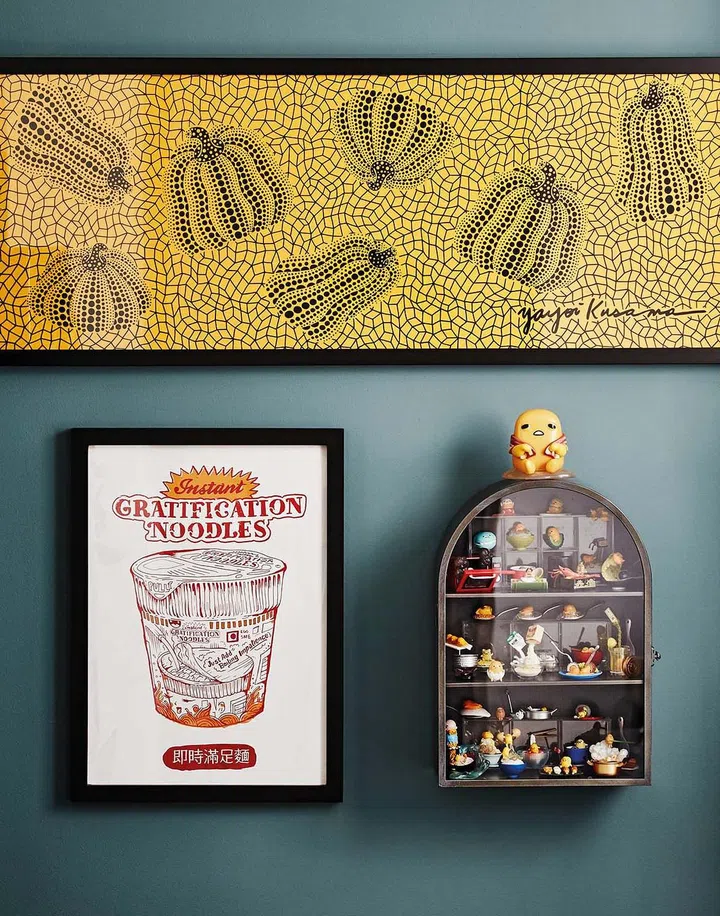 Wei Hao and Domenica chose food-related collectibles and prints for their kitchen feature wall, such as a yellow Yayoi Kusuma Pumpkins tenugui.