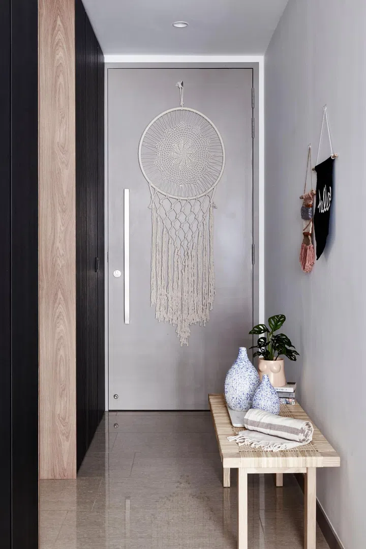 The long foyer is clad in black and wood-look laminate; the darkening effect here serves two purposes — it creates a welcoming ambience when paired with warm lighting, as well as sets the scene for an open and sunlit living and dining area.