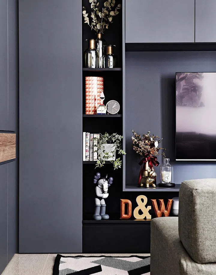 It includes a concealed shoe storage in the foyer, a full-height television console which comes with a niche just for their Nespresso machine, and a display cabinet in the study room.