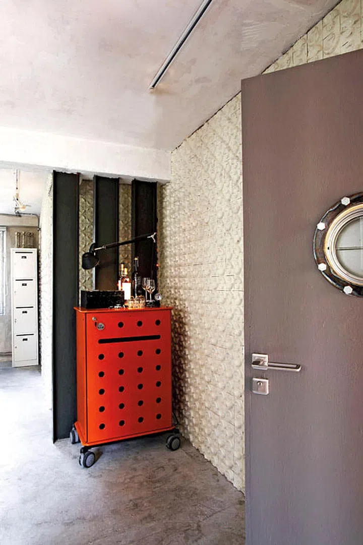 Patterned and textured tiles clad the walls in the home. The ship porthole, a rare find, is used as a giant peephole for the main door.