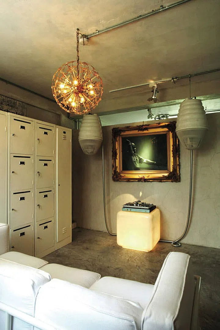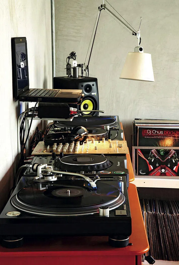 The bareness of the style created the perfect blank canvas for his eclectic furnishings. Cabinets here serve as handy perch for the homeowner's DJ console.