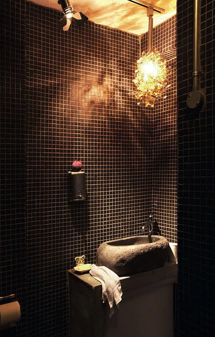 A stone bowl is repurposed into a washbasin in the bathroom. For the renovation, the homeowner spent a total of $35,000.
