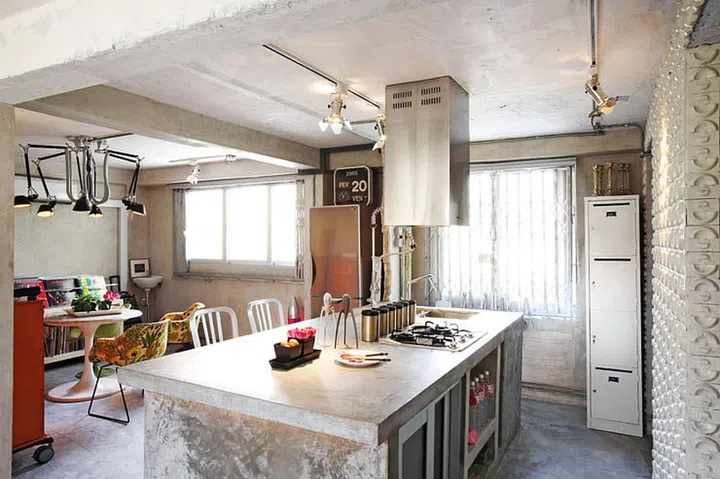 The huge kitchen island doubles as storage for kitchen accessories. The industrial look of the home was accidental as cement screed was the easiest to do.