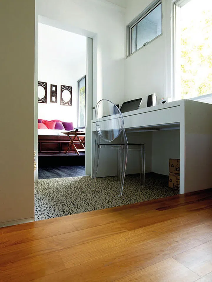 Clever space-planning turns this old walk-apartment into a cosy crib for two. To create a new living space, the walls were the first to go. More than 80 per cent of the original four-bedroom structure was taken down and reconfigured to accomodate a master bedroom and large walk-in wardrobe, a study and guest room.