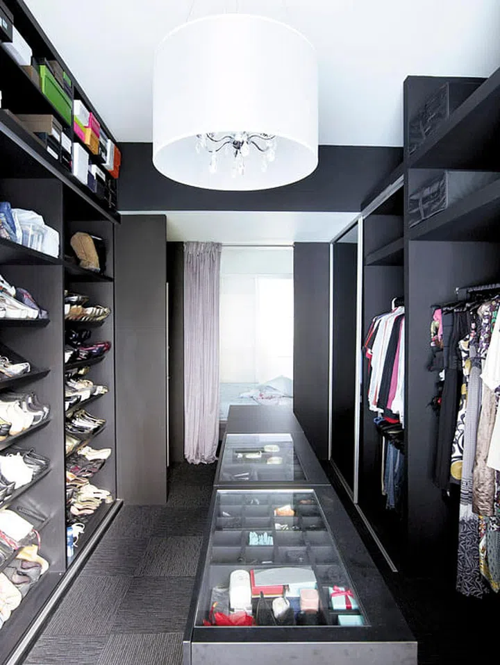 The island storage in the centre of the walk-inwardrobe is made up of three individual mobile units.