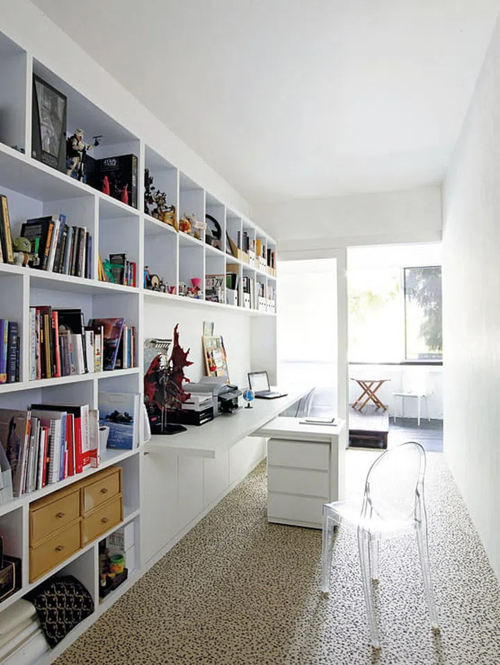 A custom-made shelf that stretches the length of the study allows plenty of storage for books, files and stationery.