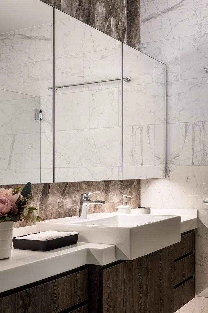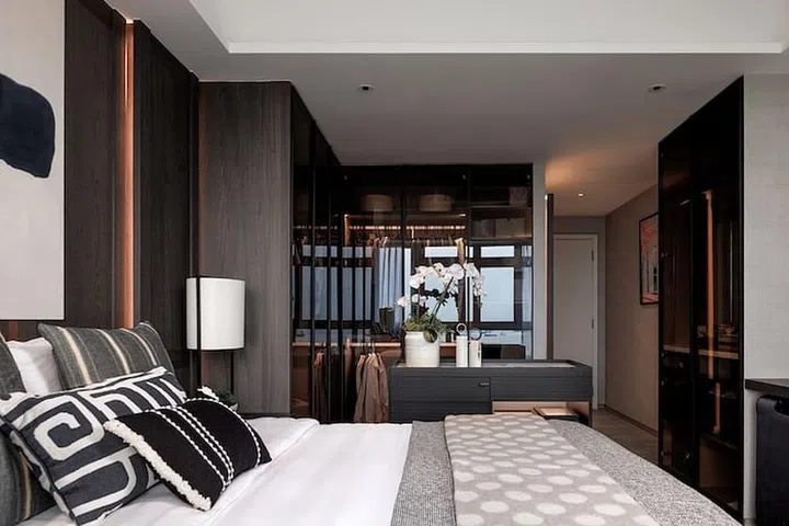 Attention to detail is of utmost importance when it comes to creating the luxe factor. Here, you'll notice that all the wiring connection for the TV is hidden behind the wall panel. Full-length motorised roller blinds were installed behind the curtain pelmet in order to give an unobstructed sea view. A light-coloured ash grey timber vinyl floor was chosen to replace the existing dark parquet timber floor. An island counter with a white Staturio marble top was created so the homeowners would have an ideal place to put their personal belongings before retiring to bed. Finally, dark tinted glass panels edged with bronze-coloured frame was used for the wardrobe doors to provide some shielding for the contents inside while still projecting a sophisticated look.