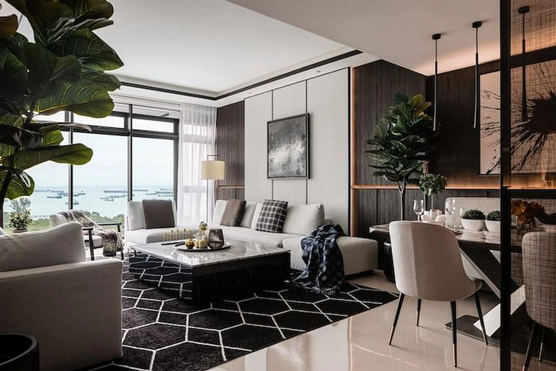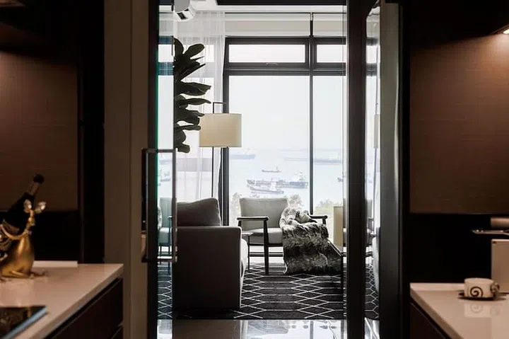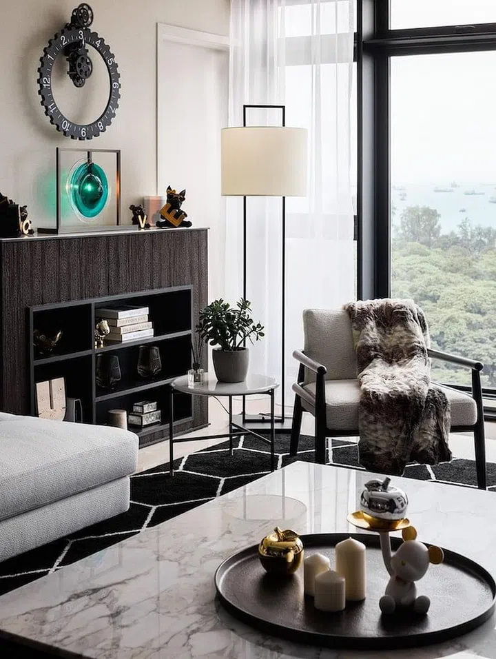 "Nothing too flashy that will clash with the beautiful & relaxing sea view to frame up the whole living room setting," Chan points out, "The slim silhouette and dark wood material of both the armchair and the wall panels help to emphasise the line work for the interior. It's simple, chic and stunning."