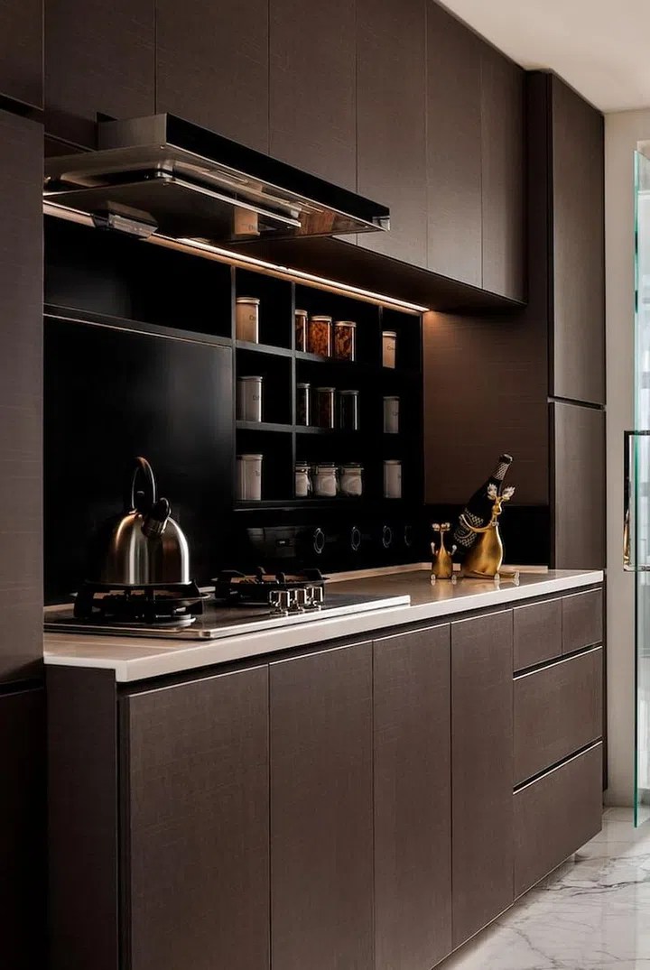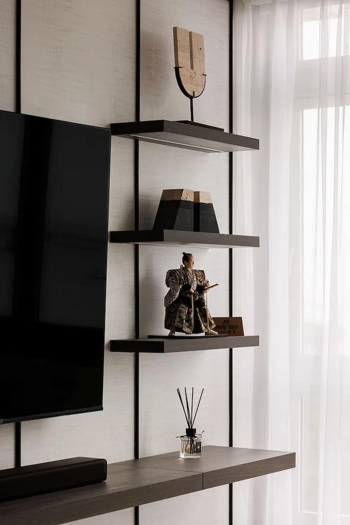 Carefully curated items adorn the open shelving beside the TV, adding to the classiness of the interior.