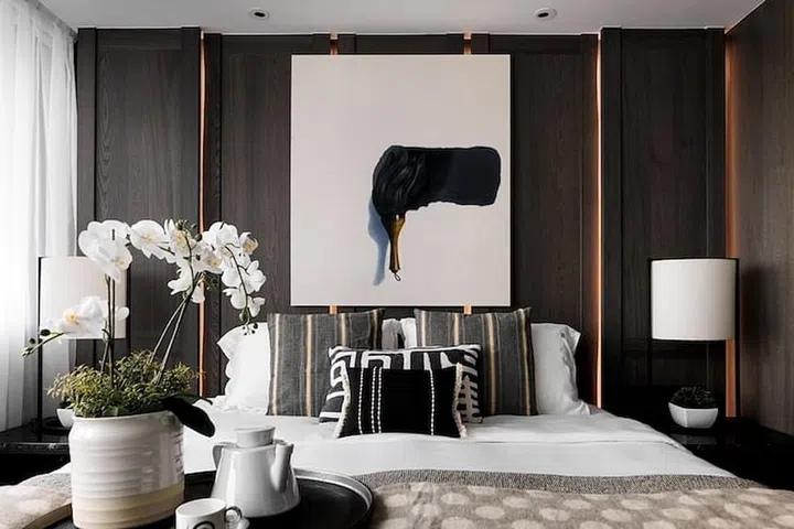 Here in the master bedroom are several key design pointers to take note of if you want to replicate the exquisite feel of the space. Firstly, the dark veneer wall behind bed was UV coated to prevent future dis-coloration from the sunlight. Back-lit LED lights run along the side to provide soft illumination to the space at night, at the same time highlighting the vertical line-work to accentuate the height of the room. If you look carefully, you'll also realise that all the shapes of the elements (from the artwork to the veneer on the wall) are created in a portrait mode to extend the visual impact and add a sense of consistency to the space.