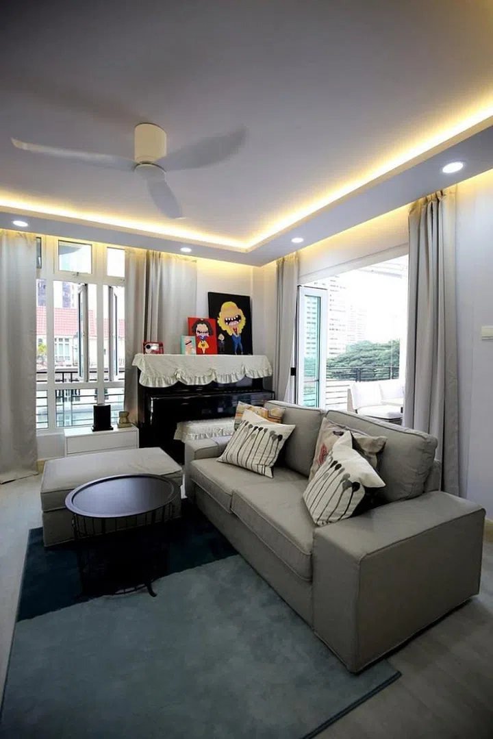 What a change! Simply swapping out the old curtains for lighter-coloured ones instantly brightened up the space, along with a neutral-grey couch in fabric. Cove lighting also adds warmth and a welcoming ambience.