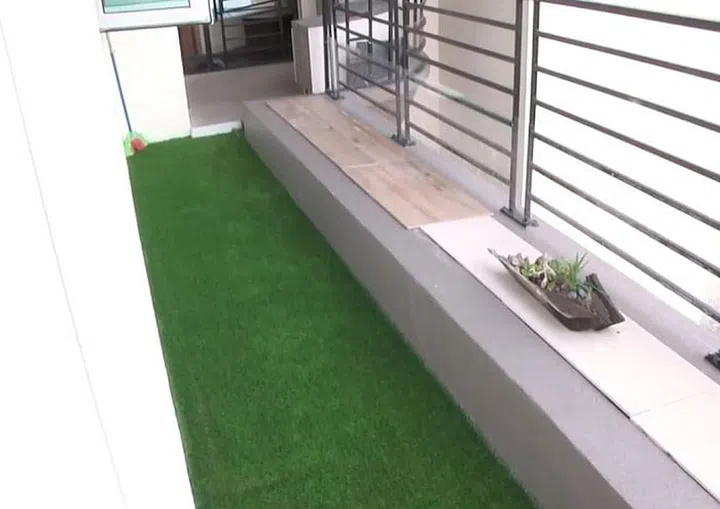 The entire balcony is also bordered by grass carpeting, giving the area a garden feel. Yi Fong also owns four dogs, so it's perfect for them to run and play on.
