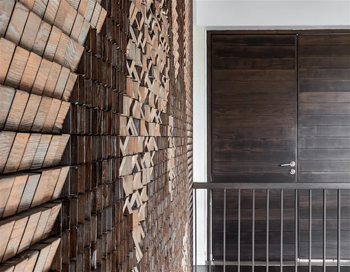 Hong Lian commissioned Dragon Pace, an art studio in Beijing, to create the two-storey-high textured feature wall constructed from pine wood blocks.