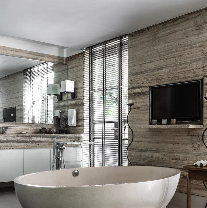 In the bathroom, the unpolished travertine marble surface is non-slip and gives a textural sensation, while adding a touch of luxury to the intimate space.