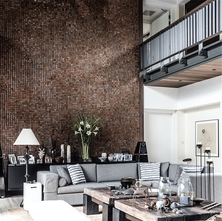 The full-height feature wall in the living room consists of wooden cubes stacked at different angles.