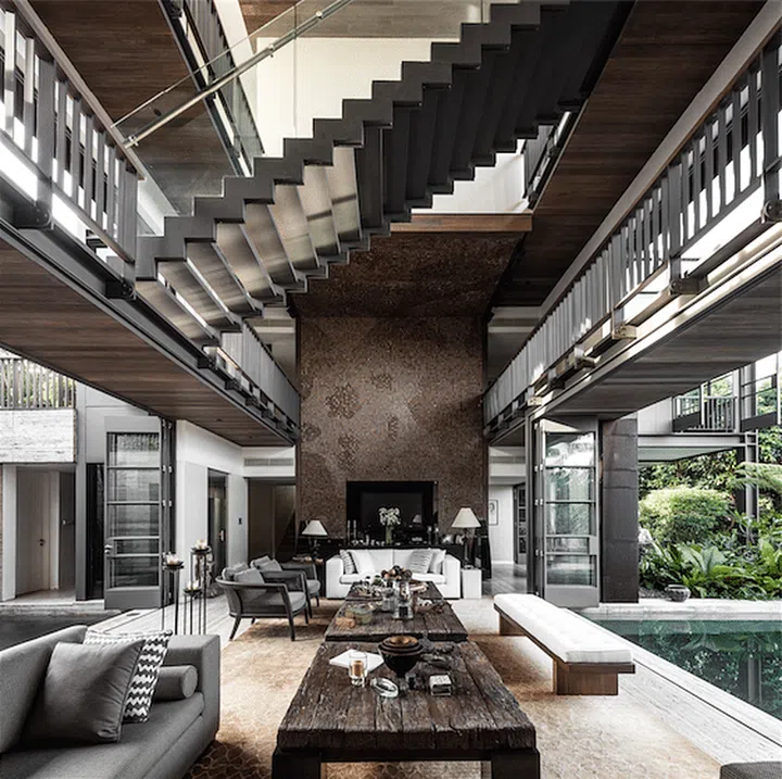 The three-storey elevation of the living room and overhanging transparent staircase allow the architectural complexities of the interiors to be visible from the main living areas.