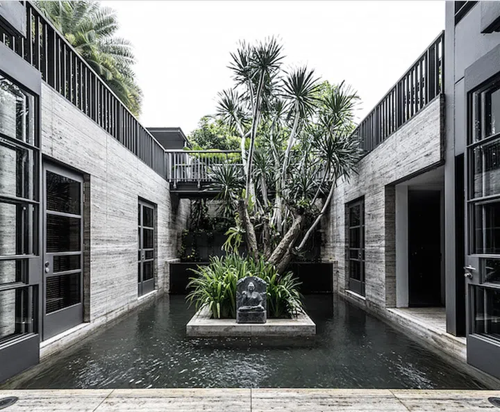 The water feature strikes a contrast with the exterior treatment of the home, and adds a touch of zen to living space.
