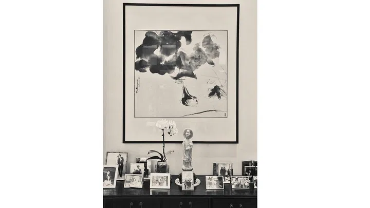 One of his favourite pieces is Autumn Lotus by Henri Chen. ''Don't ask me to explain why I love this piece, I just do,'' he says. In the foyer is a piece of the character Wu or Enlightenment, and elsewhere in the home, there are art pieces with Buddhist philosophies on them, including a commissioned piece of the Goddess of Mercy. ''I'm still trying to achieve that Zen state of mind,'' says Mr Liao.