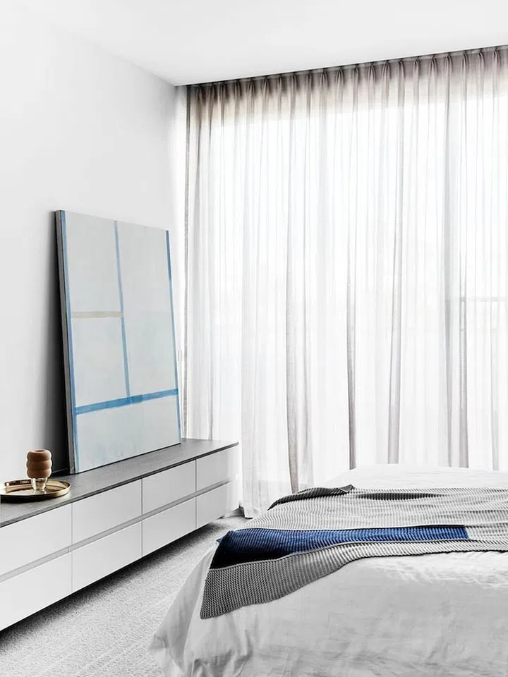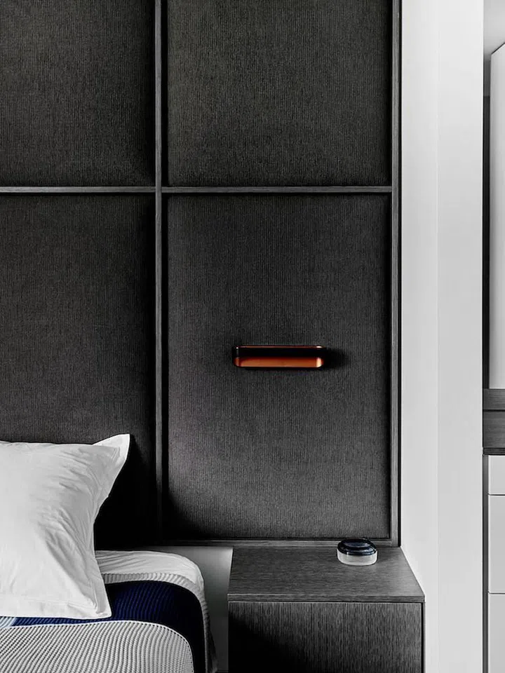 The customised padded headboard features dark-stained timber and a built-in lamp; both minimalist in form.