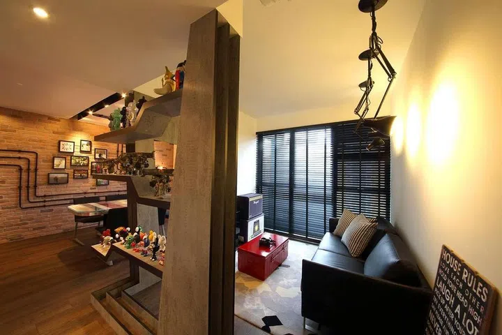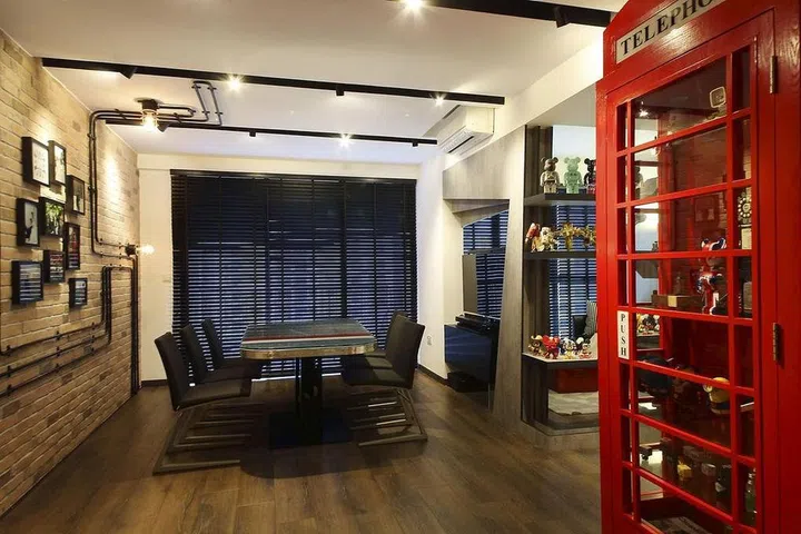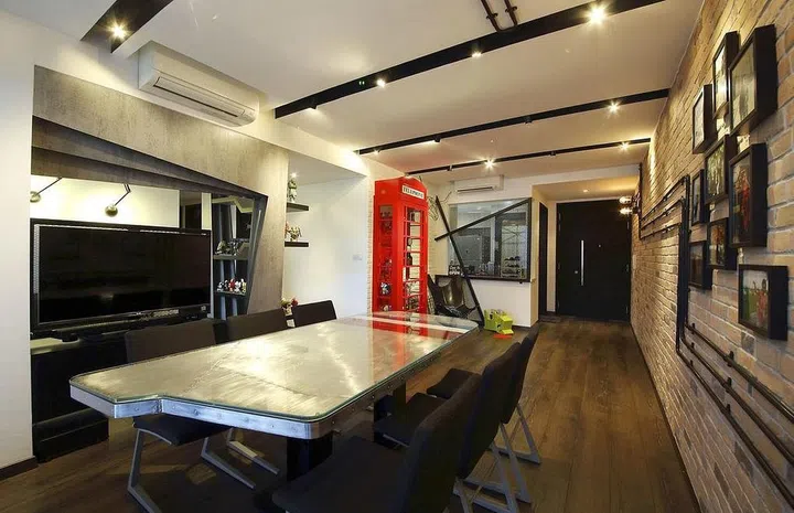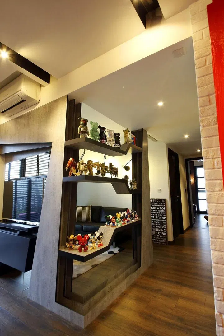 This apartment is designed to fulfil the homeowners' needs for sufficient display space for their toy collectibles. With an overall industrial-inspired look, designer Kelvin Teo of Space Sense added many interesting elements, such as a telephone booth feature that is now designed as a display cabinet, into the space.