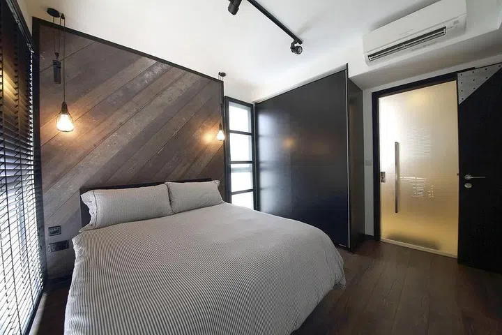 The bedroom is kept minimalist yet still maintains an industrial look, with a full-height weathered wood feature design for the headboard.
