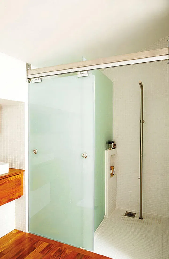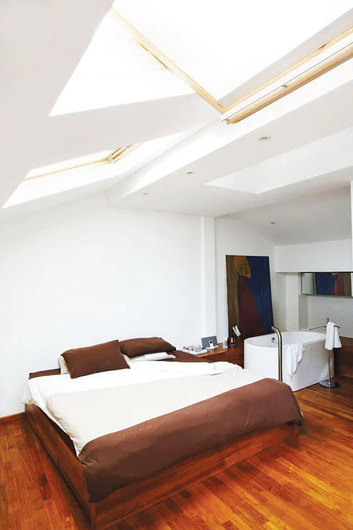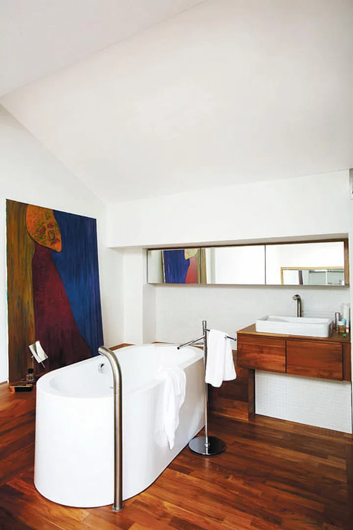 To enlarge the master bedroom, Irene hacked the bathroom wall, creating an open bathtub. She provided privacy in the shower and WC cubicles.