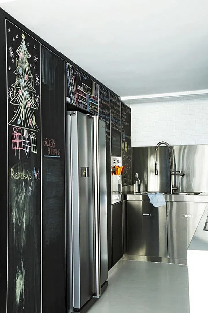 Irene used blackboard panels as cabinet doors. The family has fun doodling as well as jotting down recipes, menus and to-do lists.