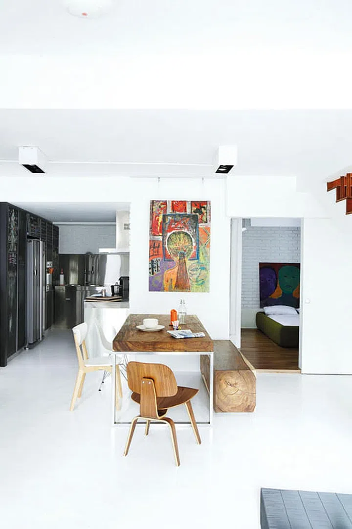 Paintings from Indonesia add colour to the neutral palette of the dining area and guest bedroom. The dining area has a happy mix of seats: a solid wood bench, Eames moulded plywood and plastic side chairs, plus an Ikea classic, the Nordmyra.