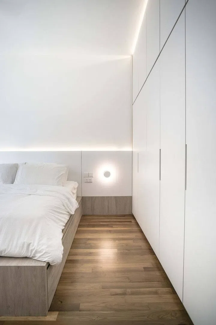 Bedroom wardrobes were cladded in a white laminate to blend seamlessly with the walls alongside it, without making the home feel claustrophobic.