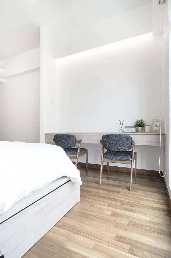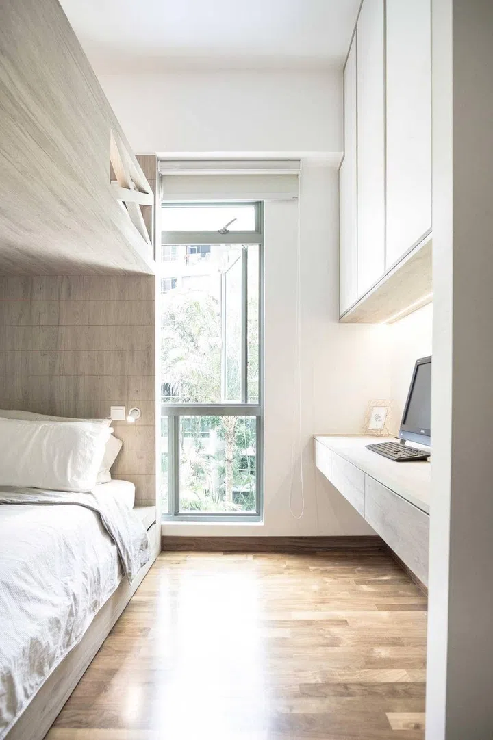Part of the approximately $130,000 renovation, the designers also made full use of wall space to include built-ins such as a study table or dresser in one of the bedrooms.