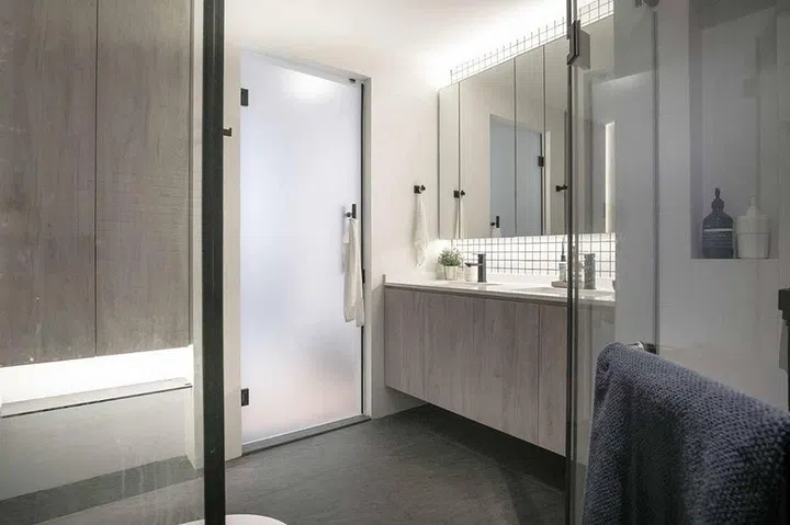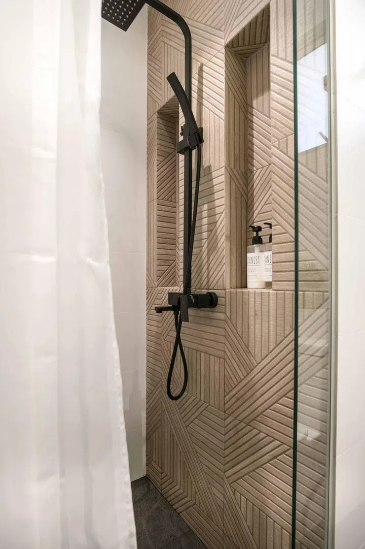 A geometric tile was chosen for the shower area in the bathroom, lending it its eye-catching, textural look.